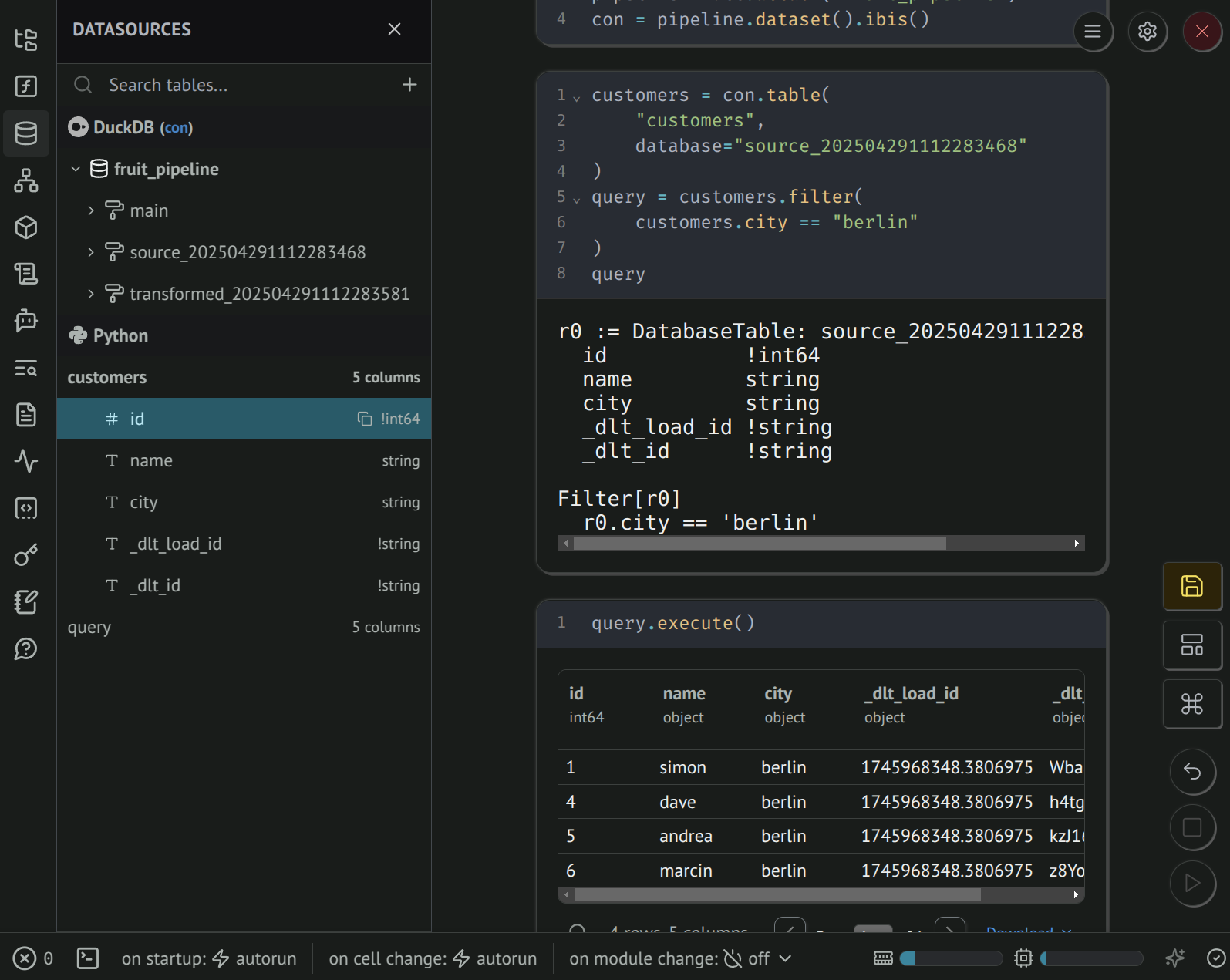 This page shows how dlt + marimo + ibis provide a rich environment to explore loaded data, write data transformations, and create data applications.